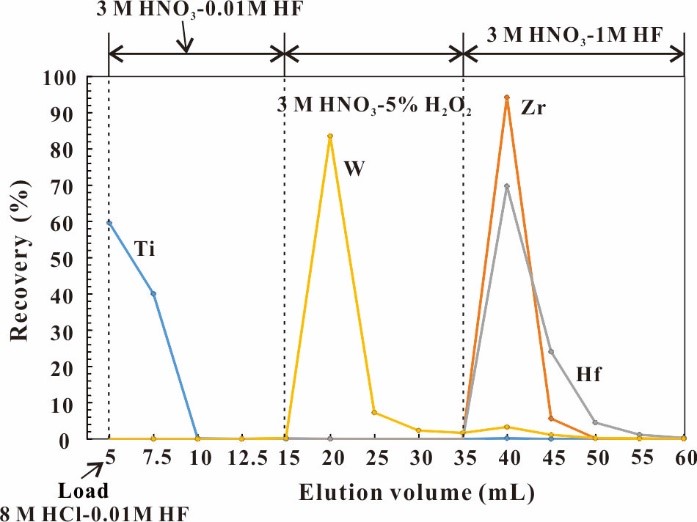 传统的W纯化的方法主要采用阴离子或阳离子交换树脂法,利用W在含氢氟酸的介质中形成氟络阴离子的特性,实现W与基体元素的分离。但是,由于Ti、Zr、Hf等高场强元素在含氢氟酸的介质中也能形成氟络阴离子,因此采用传统的离子交换技术实现W与Ti、Zr、Hf等高场强元素的完全分离存在较大难度。特别地,由于Ti在幔源岩石如玄武岩中为主量元素,含量较高,样品Ti/W比通常大于105,因此实现Ti-W的完全分离尤为困难。然而,无论采用MC-ICP-MS还是NTIMS,特别是NTIMS,Ti-W的彻底分离是高精度W同位素分析的先决条件。因此,采用传统的离子交换树脂法,一般需要进行3次甚至4次柱色谱分离,并且分离过程中,需要在解析W之前,采用大体积(>100 mL)的含有醋酸或柠檬酸的淋洗液洗脱Ti,因此耗时费力,且不利于降低流程本底。