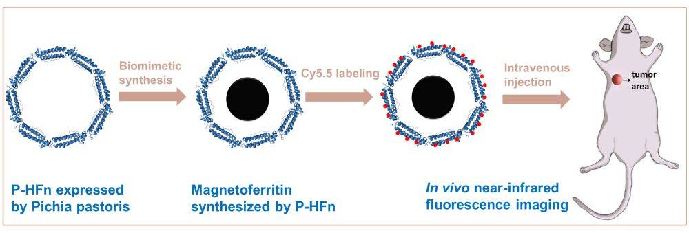 图2 毕赤酵母表达的人H亚基铁蛋白用于磁性铁蛋白纳米颗粒的合成,荷瘤小鼠的近红外荧光成像