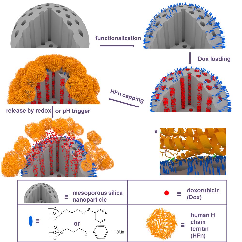 化学疗法是大多数类型癌症常用的治疗方法,但是由于肿瘤细胞对化学疗法的抵抗性以及正常细胞非特异性摄取药物所引起的副作用,这种治疗方法的功效会受到严重限制。 建立安全高效治疗性化合物转运和释放的药物递送系统极为重要。HFn内部8纳米空腔可包裹运载药物,但HFn有限的内部空腔大小限制了装载药物分子的能力。介孔二氧化硅(MSN)具有多孔结构,可调节的孔径以及易于功能化的表面,可以包载大量不同类型的化合物分子。MSNs的化学稳定性高、尺寸均匀性好和固有低毒性。其较大的表面积可以附着不同的官能团,这些官能团可与靶向特定癌细胞类型的特定配体相结合。但在使用中要封堵MSN的孔道两端防止药物分子在非目标区域扩散出去,并且在载药的MSN到达目标区域后,当受到特定内部或外部刺激后需能够打开封堵剂,确保药物从MSN释放出来。