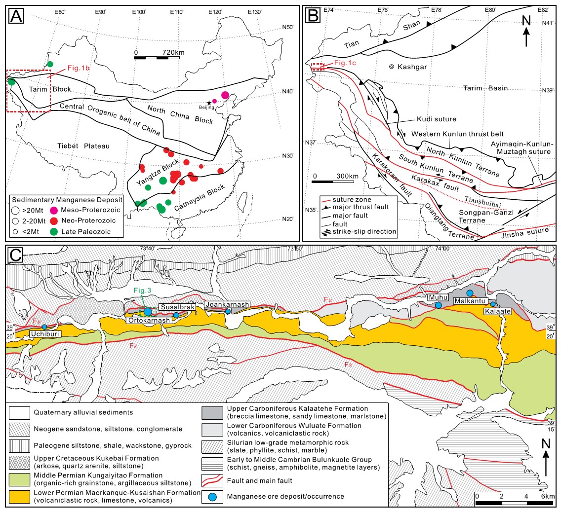 图1 (A)中国构造地质简图,展示主要沉积锰矿床的时空分布。(B)西昆仑造山带构造简图。(C)西昆仑造山带西北缘玛尔坎苏大型碳酸锰成矿带地质简图