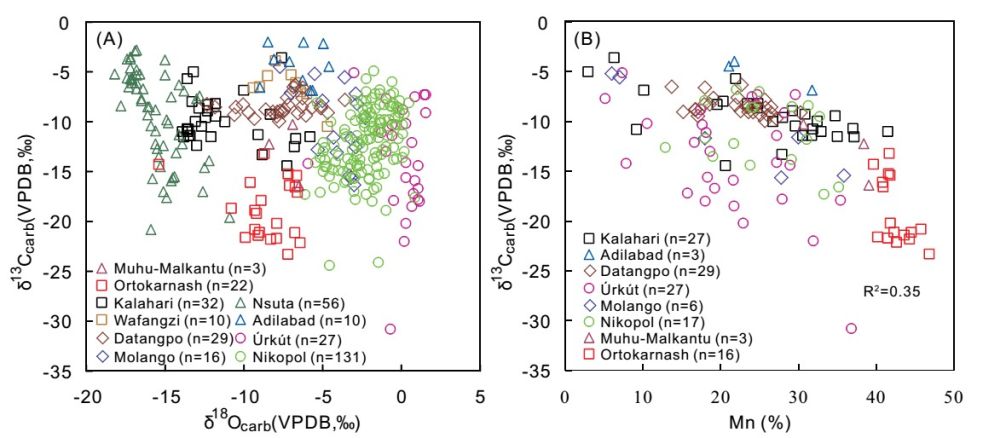 图5 全球主要碳酸锰矿床的C同位素组成特征(A)及其与Mn含量关系(B)