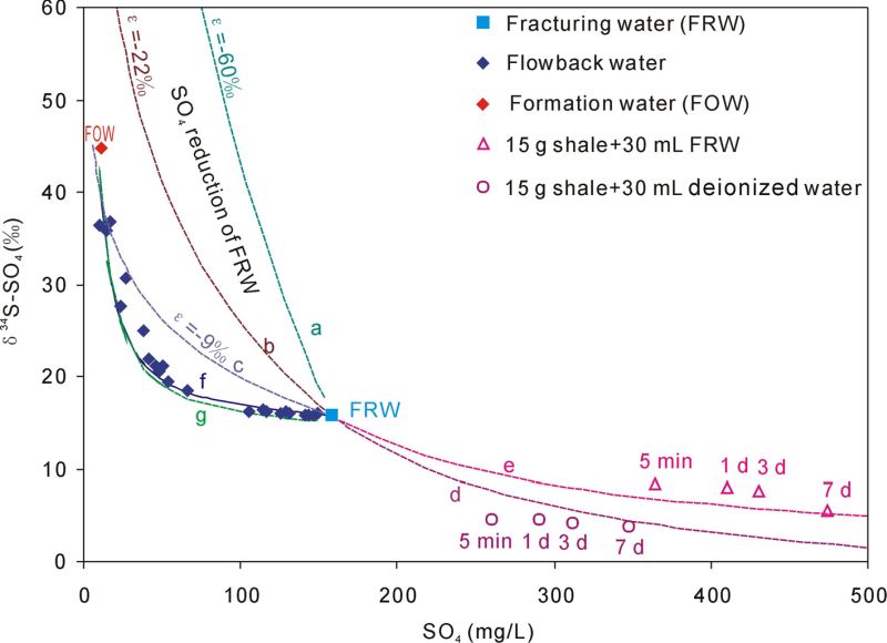 研究结果显示返排到第37-38天,返排液已经不含氚且14C含量低于6.5 pMC(压裂液氚含量为9.8 TU14C含量为93.3 pMC),说明此时的返排液基本是地层水;通过计算发现返排到第4天时,地层水已经占到了返排液的50%,两周时占到80%(图1);返排液的水化学组成整体上受控于压裂液和地层水的混合作用。除此之外,在返排初期(1-2天内)和室内水岩反应实验中,均发现了明显的阳离子交换、离子吸附与解吸附作用、重晶石沉淀等反应(图2)。虽然在室内水岩反应实验中(包括前人实验),黄铁矿氧化作用十分明显,但在现场压裂及返排中,这一过程并不明显。结合硫同位素和地球化学计算,发现返排液中硫酸盐的减少并不是由前人认为的硫酸盐还原或沉淀作用造成的,而只是由地层水(硫酸盐含量较低)主导的混合作用所引起的(图3)。