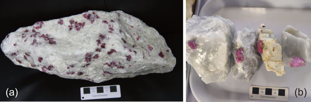 图1 (a)抹谷变质带Lin-Yang-Chi地区的宝石级尖晶石晶体(微量Cr致紫红色),寄主岩石为白云石大理岩。尖晶石(MgAl2O4)的生长消耗白云石(MgCa(CO3)2),同时形成方解石(CaCO3)并释放CO2;(b)抹谷变质带Dattaw地区的红宝石(Al2O3),寄主岩石为方解石大理岩
