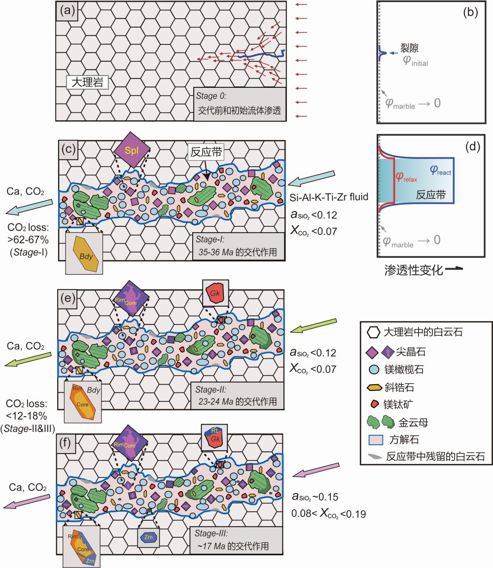 图3 抹谷大理岩中多期次流体渗透交代过程、渗透性演化和变质脱碳示意图。(a,c,e,f )大理岩中三个阶段的流体交代、(宝石)矿物生长和各个期次脱碳量;(b,d)多期交代过程中反应带的渗透性演化