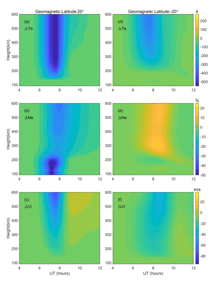 日食期间引起电离层电子温度快速变化的驱动过程主要有两种。一个是光电子沿磁力线的跨半球输运,另一个是沿磁力线的热传导过程。日食期间,日食区的太阳辐射大幅下降,光电子产生率显著降低,从而导致本该输运到共轭半球的光电子数量也大幅减少,引起共轭区的光电加热率下降;同时,日食区本身的电子温度由于光电加热的消失而大幅下降,这种降温过程也可能通过热传导过程传递到共轭半球,引起磁共轭点的温度下降。那么是哪种过程起主导作用?作者通过两个控制模拟实验,研究了耦合半球电离层扰动的主要原因,即分别切断了跨半球的光电子传输和热传导过程。模拟结果表明,共轭半球的电离层扰动是由跨层光电子输运、热传导和热层风变化的综合作用引起的。