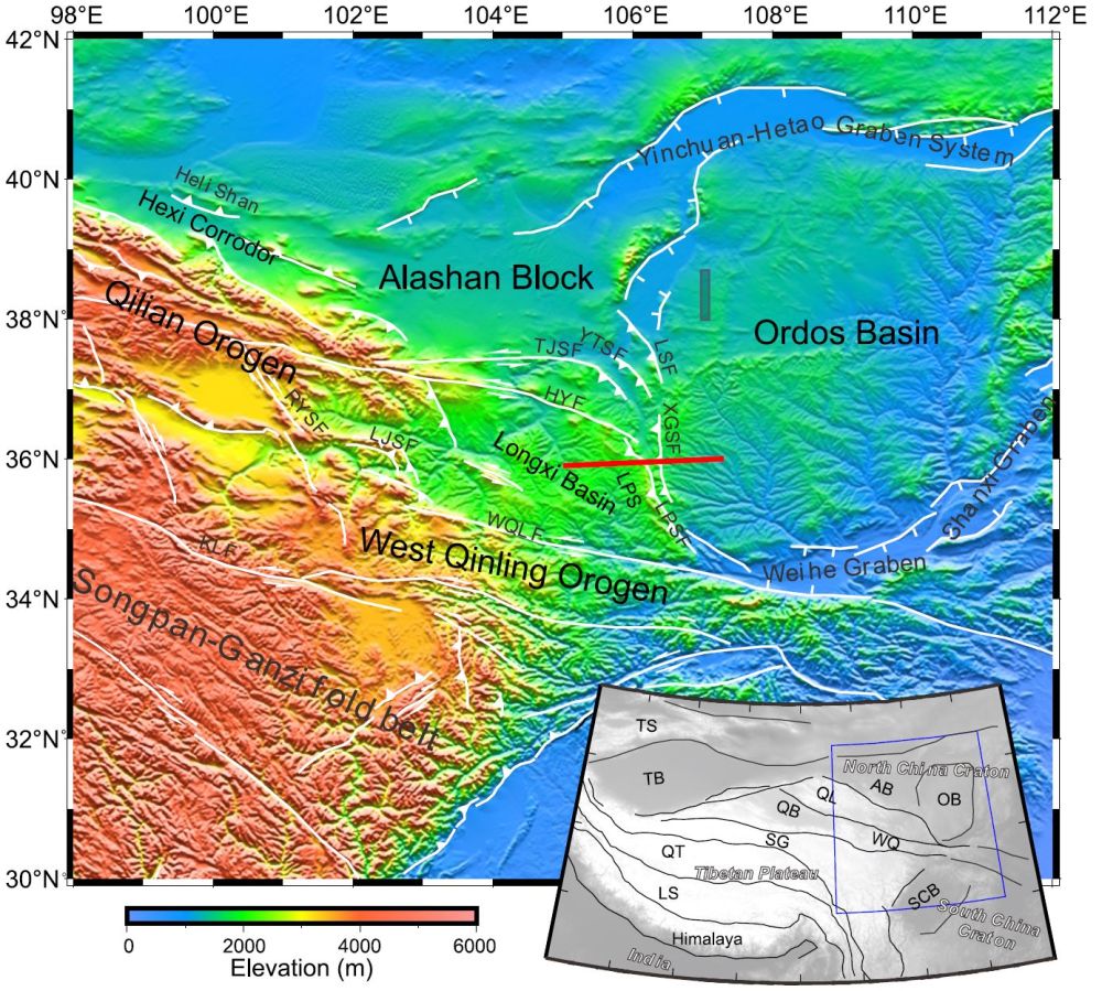 图1 青藏高原东北缘及鄂尔多斯的地形和主要断裂(白线)分布。红线为短周期密集台阵的位置。AB: 阿拉善块体;HYF:海原断裂;KLF: 昆仑断裂;LJSF:拉吉山断裂;LPS: 六盘山;LPSF:六盘山断裂;LS: 拉萨块体;LSF:罗山断裂;OB:鄂尔多斯盆地(或块体);QB:柴达木盆地(或块体);QL:祁连造山带;QT:羌塘块体;RYSF:日月山断裂;SCB:四川盆地(或块体);SG:松潘甘-孜褶皱带;TB:塔里木盆地;TJSF:天景山断裂;TS:天山褶皱带;WQ:西秦岭造山带;WQLF:西秦岭断裂;XGSF: 小关山断裂;YTSF:烟筒山断裂