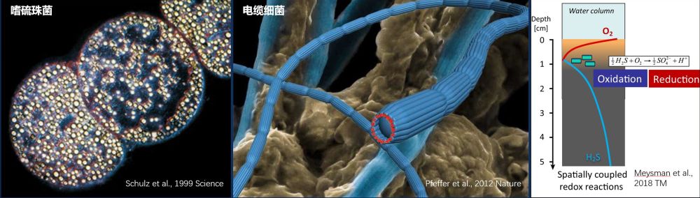 图1 各种硫细菌各显神通跨越“有氧-无氧界面”。电缆细菌充当硫氧化还原的电子传递体,而嗜硫珠菌充当硫物质的转运使者