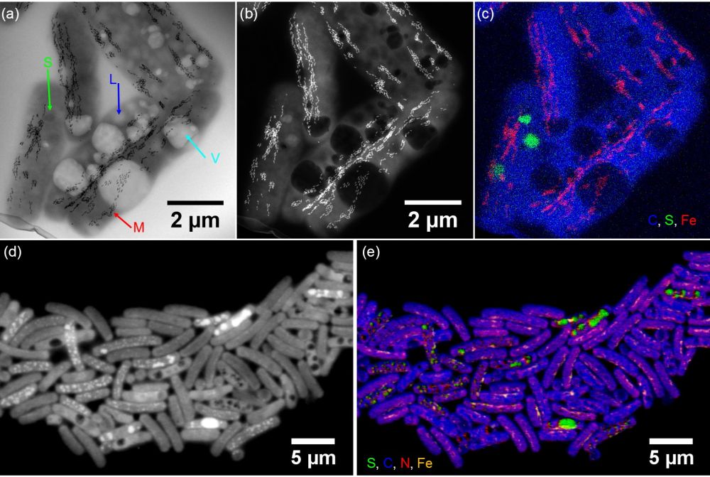 为了认识趋磁大杆菌 趋磁性、生物矿化、生理代谢三者之间的内在联系,中科院地质与地球物理研究所地磁场与生物圈演化学科组研究团队联合加拿大同步辐射光源实验室和澳大利亚国立大学的合作者,综合透射电子显微学、同步辐射和单细胞宏基因组学技术对发现自天津于桥水库的趋磁大杆菌进行了深入研究。结果发现: