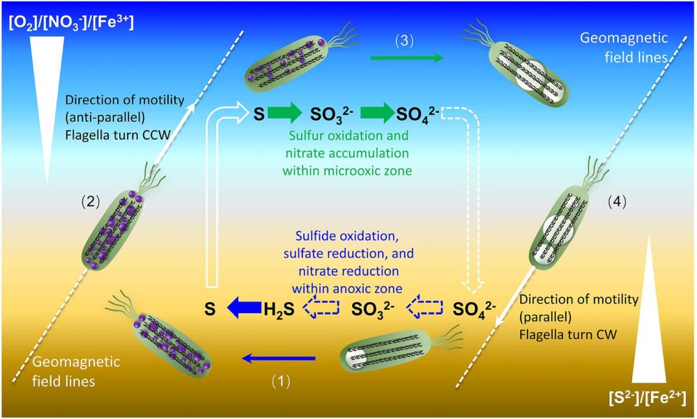 研究发现趋磁细菌可能是一类重要的微生物功能群,他们利用地磁场的定向作用,在有氧-无氧界面(OAI)中上下穿梭,从而将OAI上部有氧或微氧与其下部的厌氧环境联动起来,进而驱动碳、氮、硫和铁等在地球水生环境的无氧与有氧环境中的元素循环。