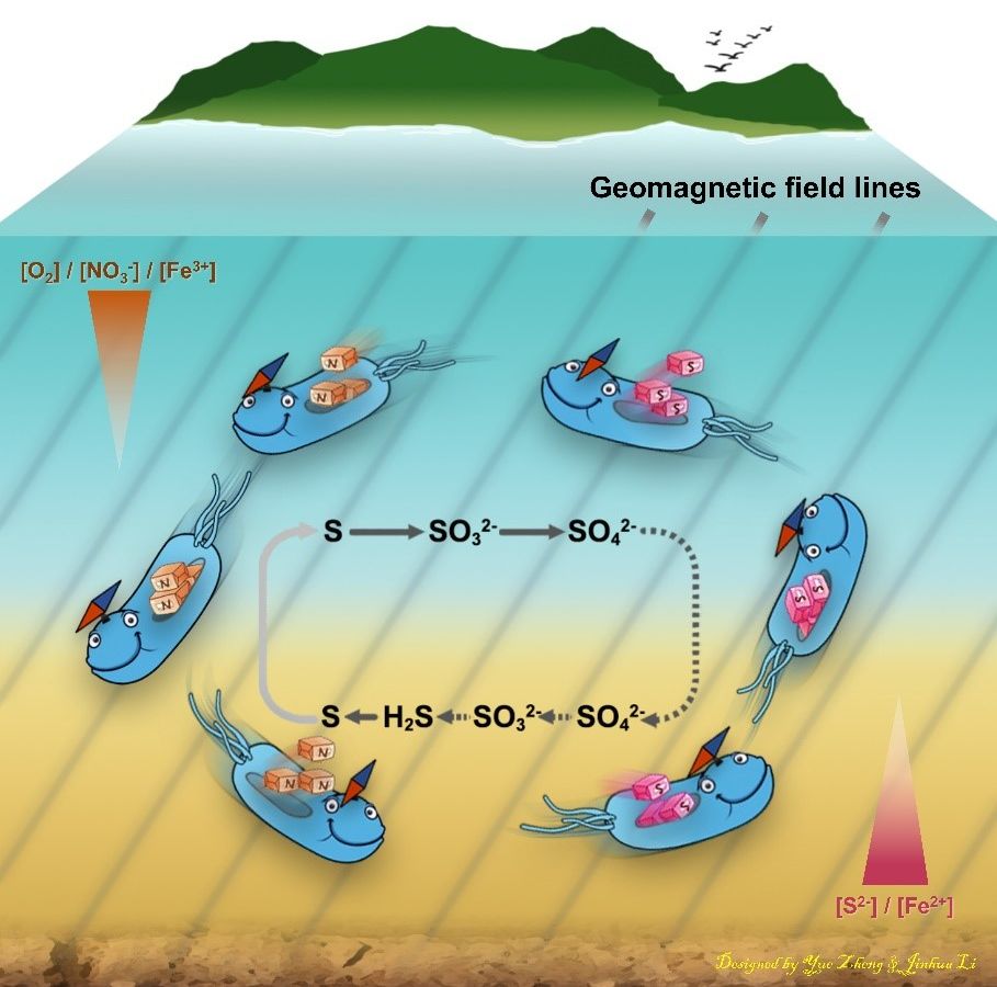 这幅卡通图展示了趋磁细菌利用地磁场的定向作用,在水体中向上向下来回穿梭,不仅将不同类型化学物质上下运输,还将其在OAI上部的有氧代谢过程(硫氧化和硝酸盐吸收等)与OAI下部的厌氧代谢过程(硫酸盐还原、硫的部分还原及沉积和硝酸盐还原等)联动起来,从而促进细胞的生长和磁小体的生物矿化(设计:郑越,李金华