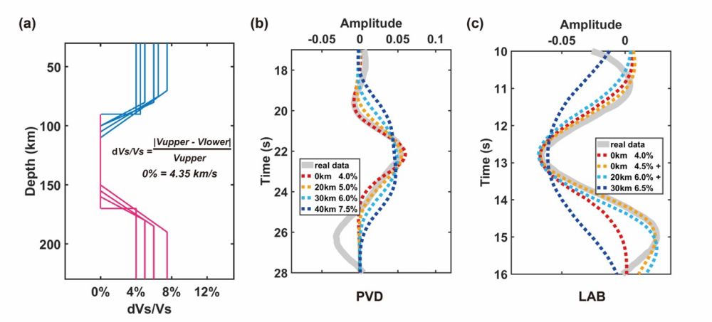图3 (a)用于拟合速度间断面结构的1-D速度模型;(b)软流圈低速层底界面(PVD)拟合结果;(c)岩石圈-软流圈边界(LAB)拟合结果