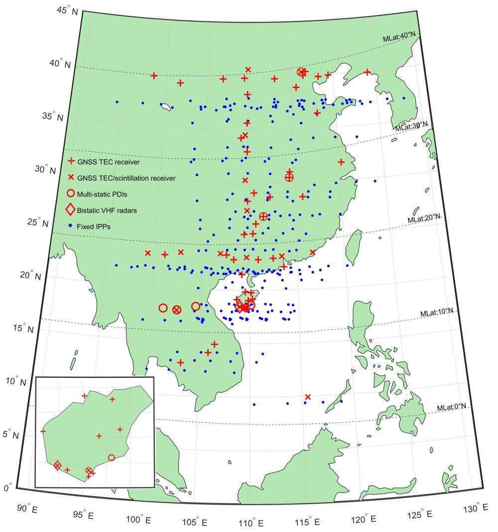 因此,中科院地质与地球物理研究所空间环境探测实验室自2017年起着手在南中国及周边地区建立具有多种探测仪器的电离层不规则体和闪烁观测网(IONISE,http://ionise.geophys.ac.cn/),致力于南中国及周边多种尺度多种类型的电离层扰动和不规则结构的探测研究。截至目前,该网络主要包含三条分别沿着北纬40°、北纬23°和东经110°架设的GNSS TEC/闪烁观测链、多基站PDI测高仪观测阵和低纬双基站VHF雷达,以及多种补充仪器和多个补充站点(图1)。