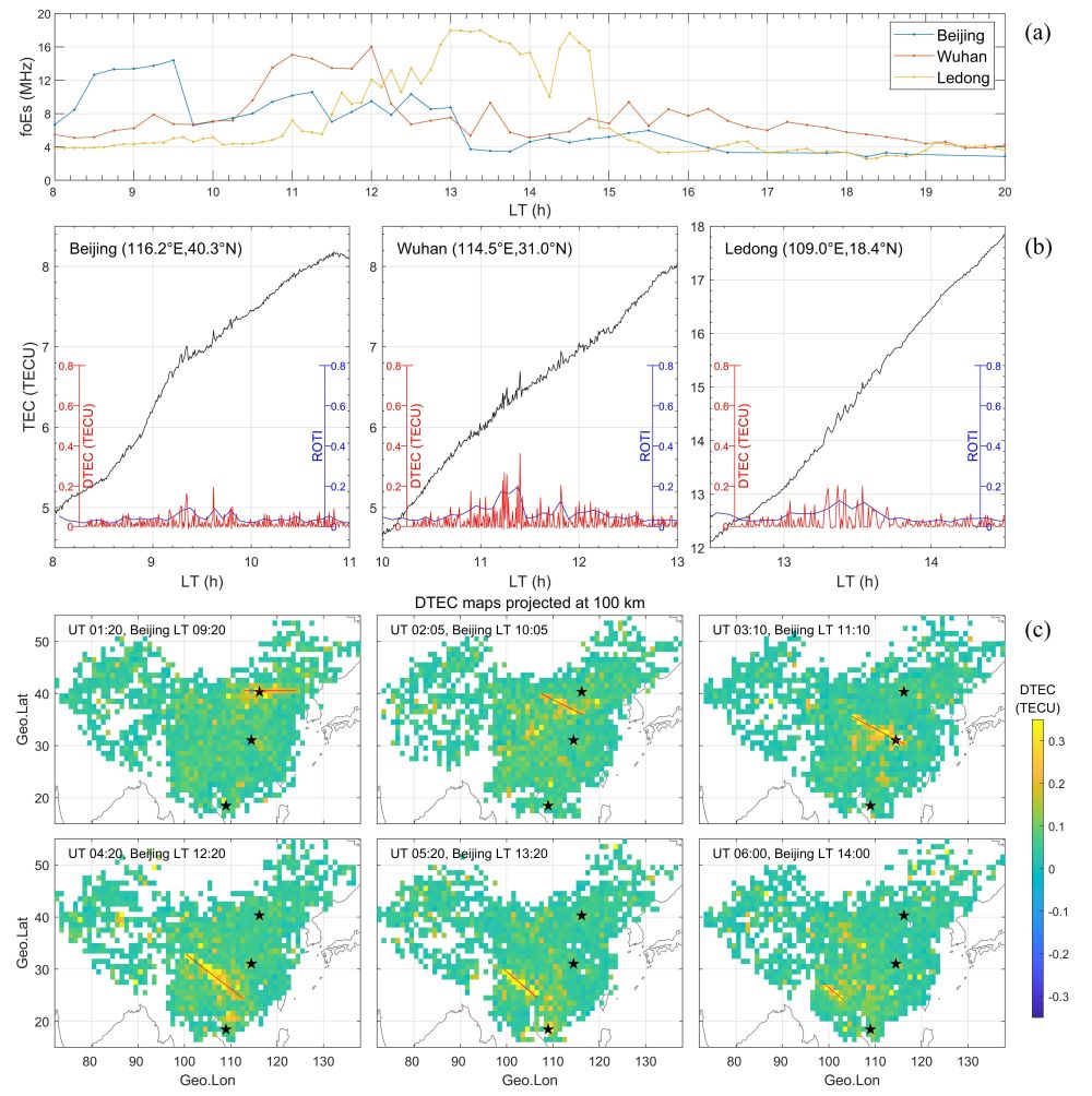 电离层偶发E层(Sporadic E layer,简称Es层),存在于地面上方90-130 km以内的空间区域,其层内电子密度高,会使经过它的无线电波产生反射、散射或折射,实现远距离高频或甚高频通信,强的Es结构常伴随有各种尺度的电离层E区不规则体,可引起无线电信号闪烁、卫星信号失锁、测距误差等,进而对通信、导航和雷达探测等产生严重影响。因此,对Es的时空演变特性研究具有重要的现实意义,是电离层研究的热点之一。以往的研究表明,东亚地区是Es的高发地区。利用传统探测仪器如电离层测高仪、VHF雷达等,以往的研究得到了Es在雷达探测视场内的形态特征和不同地区的统计发生规律,但限于这些仪器有限的站点分布,无法在较大的空间范围内对Es进行高时空分辨率的观测研究,得到大尺度Es的空间形态、运动特性和演变过程等。