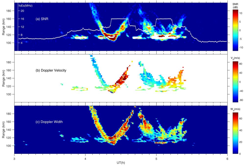 利用IONISE观测网的综合观测数据,空间环境探测实验室开发了从GNSS TEC数据中提取强Es扰动并映射到二维地图从而获得其形态结构和运动特性的方法。利用多种观测仪器对典型事例的联合探测发现,强Es结构可在中国中纬地区产生,漂移数千公里到达低纬地区(图2),在经过三亚的VHF雷达探测视场时,会在雷达的视距-时间-强度(RTI)图像中形成独特的V形后向散射回波(图3),回波左翼(右翼)对应负(正)的多普勒速度。这种回波不同于雷达以往常规探测到的E区连续性回波或准周期回波,而是由于Es结构的漂移、Es层内陡峭的电子密度梯度以及雷达的宽波束及旁瓣探测等多重原因综合所致。