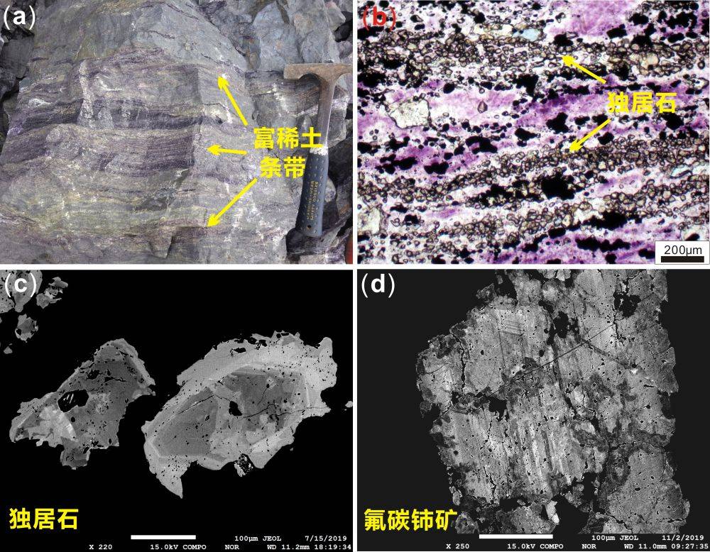 图1 (a)富稀土的条带状矿石;(b)矿石显微照片,可见稀土矿物密集分布;(c)和(d)独居石和氟碳铈矿经历了热液改造,在BSE图像下呈现复杂的结构