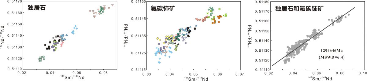 图3 独居石和氟碳铈矿Sm-Nd同位素成分呈线性分布,等时线年龄约为13亿年(图中不同符号代表不同样品)