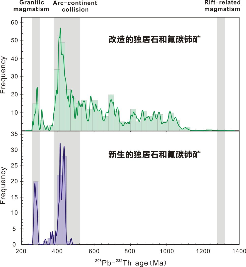图4 改造及新生独居石Th-Pb年龄频谱图