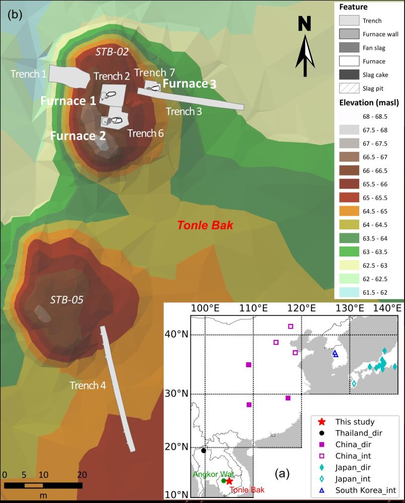 东南亚地区正是上述全球数据匮乏区之一。中科院地质与地球物理研究所蔡书慧副研究员联合美国加州大学圣迭戈分校Lisa Tauxe教授、美国芝加哥伊利诺大学考古学家Mitch Hendrickson副教授、澳大利亚14C定年专家Quan Hua博士和柬埔寨考古项目组专家等,对位于东南亚柬埔寨北部的一处古代冶铁遗址(Tonle Bak)开展了考古磁学研究,获得了该地区首批地磁场全矢量数据。研究结果不仅大大改善了全球考古磁学数据结构,还记录到地磁场负异常,为认识低纬度地区地磁场特征及核幔边界结构提供了新思路,并为今后相关区域考古磁学工作提出了新方向。