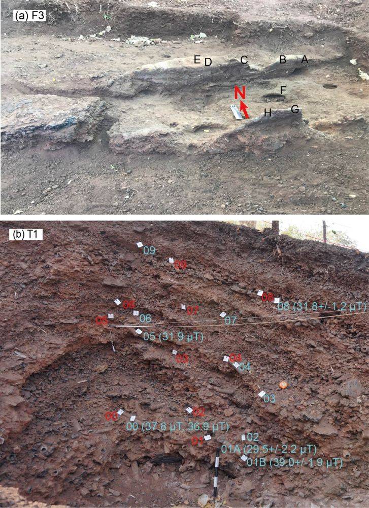 图2 (a)代表性窑址(F3)定向样品采样照片。图中字母代表定向样品采集位置;(b)代表性发掘沟(T1)非定向样品和碳屑采样照片。蓝色数字为非定向样品采集位置,旁边括号中为样品记录的古强度值,红色数字代表碳屑采集位置