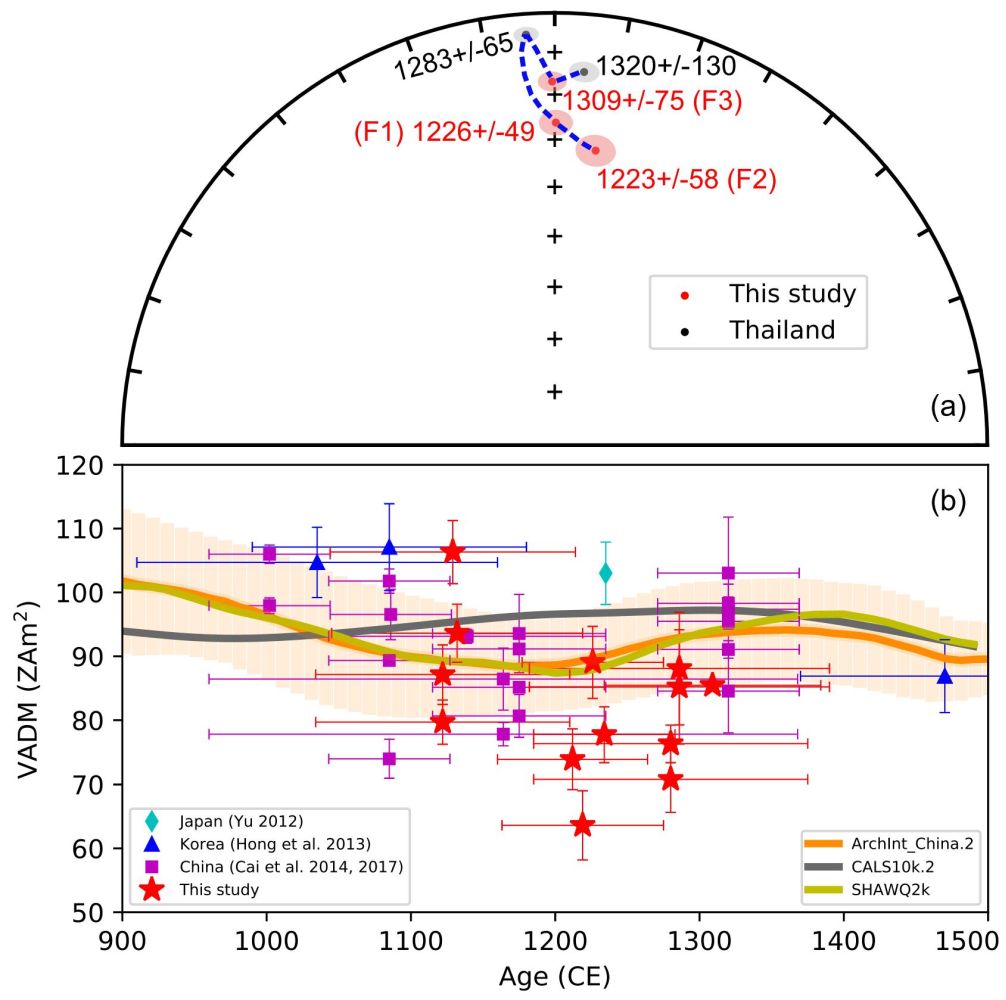 图3 (a)地磁场方向结果。红色为本文新增结果,黑色为泰国已发表结果,蓝色虚线代表地磁场方向移动轨迹;(b)地磁场强度结果。红色五角星为本文新增结果,其余符号为已发表数据,详见图注。桔色、灰色和黄绿色实线分别为中国考古强度参考曲线和全球模型CALS10k.2和SHAWQ2k对采样位置预测结果