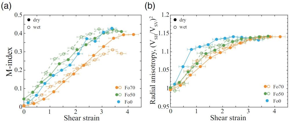 图2 (a)CPO强度和(b)径向各向异性随着剪应变的演化。橙色是Fo70,绿色是Fo50,蓝色是Fo0。实心圆和实线为不含水条件,空心圆和间断线为含水条件