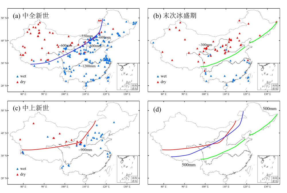 图2 重建的末次盛冰期(b、d;绿线)、中全新世(a、d;蓝线)和中上新世(c、d;红线)干湿分界线以及和现代干湿分界线(d;粗黑线)的对比。蓝色为湿润点,红色为干旱点(a-c);实心圆点表示根据孢粉定量重建的年降水量点