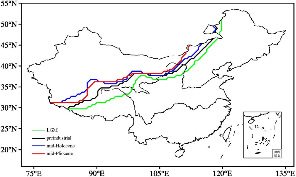 图1 末次冰盛期(绿线)、工业革命前(黑线)、全新世中期(蓝线)以及中上新世(红线)东亚夏季风北边缘位置变化