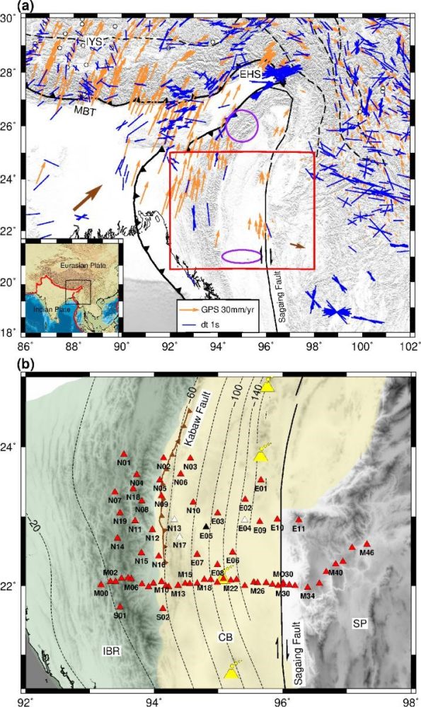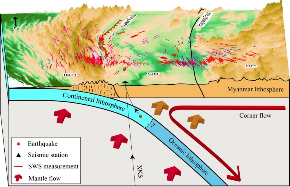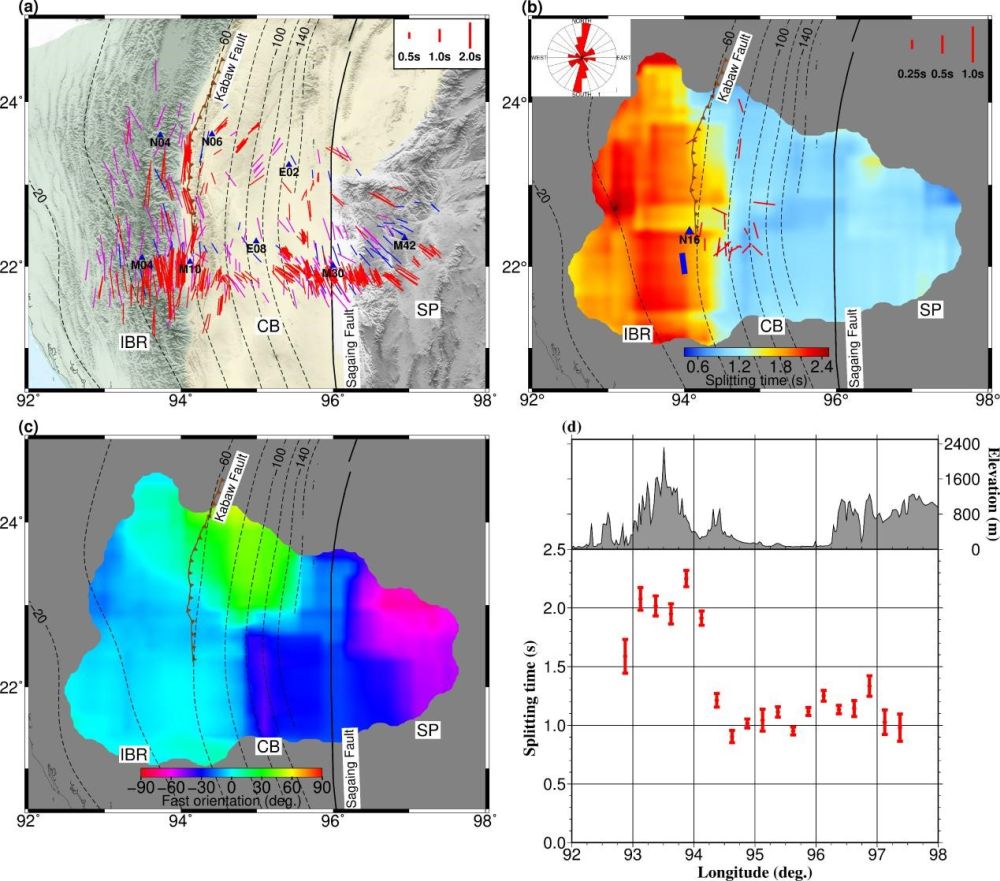中国科学院地质与地球物理所地球与行星物理院重点实验室博士生范恩博与导师艾印双研究员、何玉梅研究员及美国密苏里科技大学Stephen S. Gao教授等人,基于2016年800彩票和缅甸地球科学学会、青藏高原研究所合作在缅甸中部布设的该国第一个密集流动地震台阵所采集回的高质量数据(图1b),在XKS震相剪切波分裂分析的基础上,辅以近震直达剪切波分裂和接收函数中Pms震相分析,系统研究了该区域各向异性的空间变化和主要来源深度,初步建立了研究区深部动力学模型。