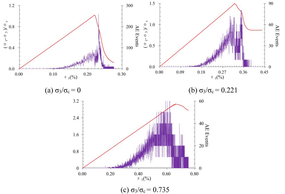 针对以上问题,页岩气与地质工程重点实验室郭松峰副研究员、祁生文研究员等人开展了研究。他们发现,岩体在高围压下以剪切裂纹为主,在工程开挖扰动状态条件下,随着径向卸荷围压降低,张剪性裂纹逐渐占主导(图3)。研究表征破裂的声发射事件发现,原位高围压情况下岩体的破裂主体发生在峰值强度前,且岩体破坏呈现延性特征,而在扰动卸荷围压降低情况下,岩体的主破裂集中发生在应力应变曲线的峰后下降段,呈现急剧的脆性破坏特征(图4),在工程中常常表现为岩爆等剧烈破坏。通过研究岩体破坏过程中局部应力分布发现,与未扰动高围压情况相比,岩体在扰动卸荷低围压情况下的局部应力集中程度明显增大,从而诱发了岩体张剪性脆性破裂(图5)。研究成果深化了对岩体材料因应力状态变化发生破坏的认识,揭示了工程开挖卸荷后高储能岩体的细观破坏机制,对工程扰动下非均质岩体破裂致灾防控具有一定的指导价值。