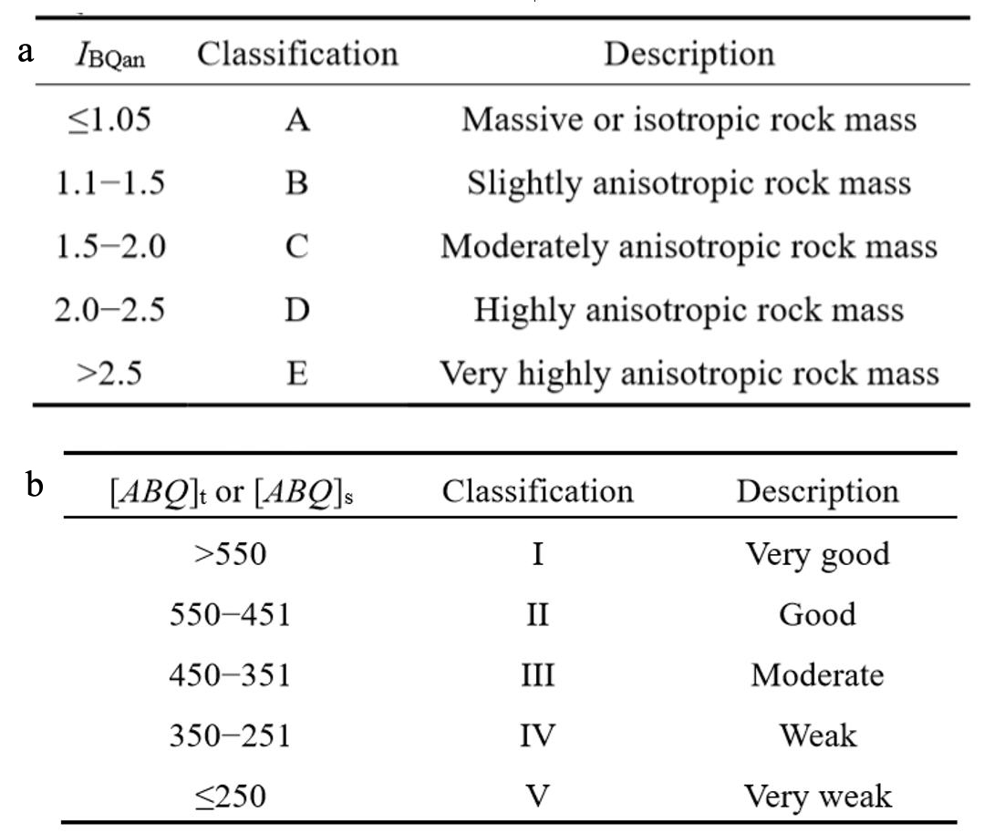 表1 各向异性岩体分级系统(ABQ)。(a)各向异性岩体程度分级;(b)各向异性岩体质量分级