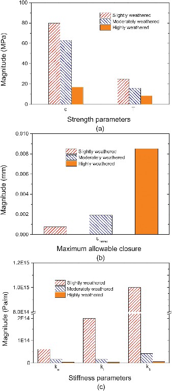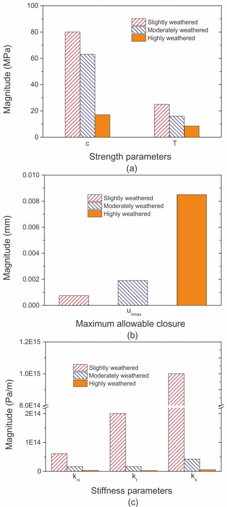 图4 花岗岩内部矿物颗粒接触参数量值随风化程度的变化。(a)强度参数;(b)最大容许压缩变形;(c)接触刚度参数