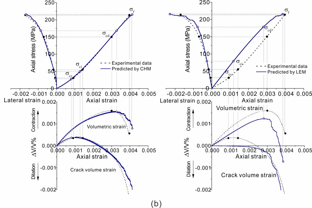 如图3,对三种不同风化程度花岗岩的单轴压缩实验结构进行模拟,发现微风化的LdB花岗岩矿物颗粒接触界面比较紧密且风化裂隙较少,单轴压缩应力-轴向应变曲线呈现近似线性特征,常规的线性模型和AGBM均能得到与试验结果相匹配的结果(如图3a);中风化的SJK花岗岩中部分矿物颗粒接触界面发生松动,风化裂隙增多,单轴压缩应力-轴向变形曲线呈现非线性特征,变形模量以及峰值应力等应力阈值较微风化LdB花岗岩降低,常规的线性模型预测结果显著偏离试验结果,而AGBM的预测结果与试验结果非常吻合(如图3b);强风化的MYB花岗岩中较多的矿物颗粒接触界面发生松动甚至填充,风化裂隙明显增多,单轴压缩应力-轴向变形曲线呈现明显的非线性特征,变形模量、峰值应力等应力阈值与LdB花岗岩、SJK花岗岩相比显著降低,常规的线性模型预测结果与试验结果相差较大,而AGBM的预测结果与试验结果非常吻合(如图3c)。由以上结果可以看出,传统的纯线性接触模型仅适用于新鲜或微风化岩石,具有明显的局限性,而提出的AGBM适用于不同风化程度岩石的微观结构对其宏观力学行为影响的定量刻画,具有显著的优势。