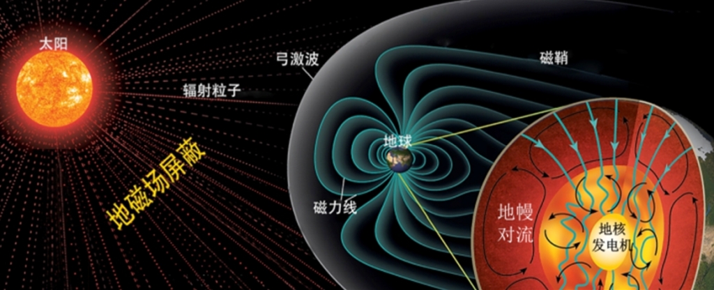 众所周知,地球具有全球性的偶极磁场。 地球偶极磁场起源于内部发电机,向外延展到太空,与外部太阳风等离子体发生相互作用,形成磁层空间。地球全球偶极磁场能有效屏蔽太阳风的高能带电粒子轰击,使得磁层犹如一个保护罩庇护了地球的大气圈、水圈、生物圈等(见图1)。