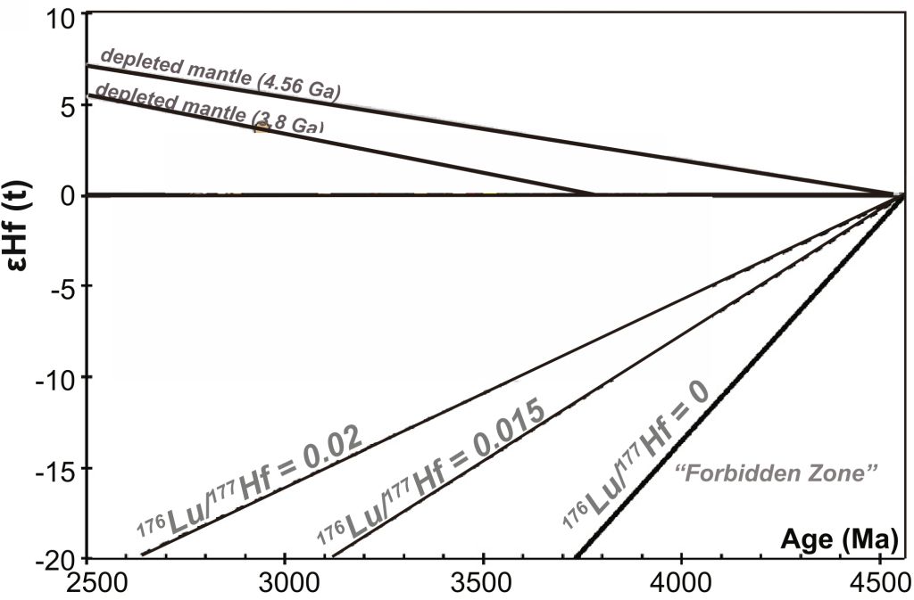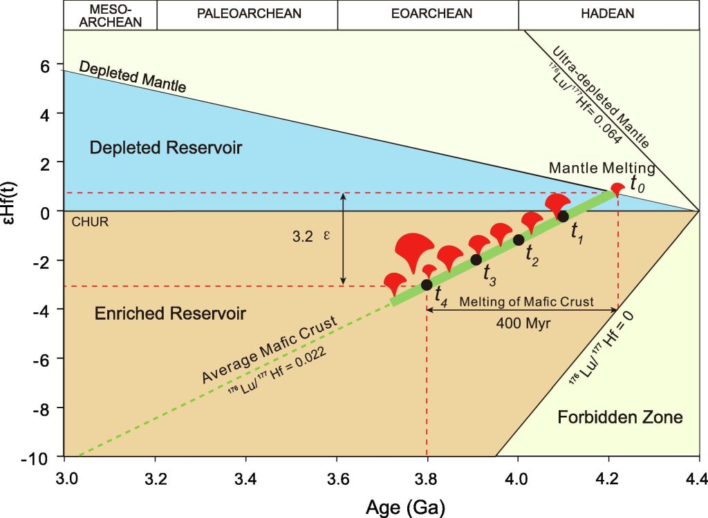 绝大多数始太古代-冥古宙的锆石都是来自于TTG(英云闪长岩-奥长花岗岩-花岗闪长岩)岩石。地球化学和实验岩石学证据表明,TTG通常由富集的镁铁质源区分异而来,那么利用这些锆石所得到的地幔源区的成分也自然应该是富集地幔的特征。实际上,对全球TTG的微量元素和同位素数据的统计也证实了这一点:即TTG的原岩所对应的地幔源区也应是未分异的。亏损源区不容易形成TTG,自然不容易被TTG中的锆石所记录。