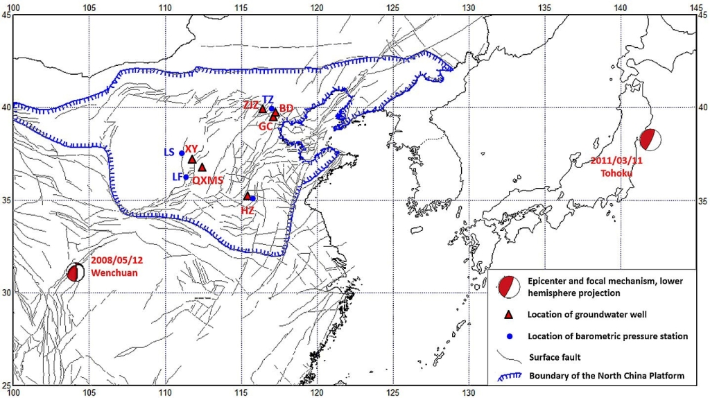 针对上述问题,中科院地质与地球物理研究所地球与行星物理院重点实验室张艳副研究员与加州大学伯克利分校王其允教授等合作,以华北地台为例,对其地下水位、气压观测质量较高,上覆盖层为极低孔渗的泥岩/页岩地层的流体井进行了首次无前提假设参数的潮汐响应混合流模型测试,计算垂向渗透率(及气压系数),估算盖层封闭性,并且分析大地震(2008 MW 7.9 Wenchuan 、2011 MW 9.1 Tohoku)对封闭性的影响。