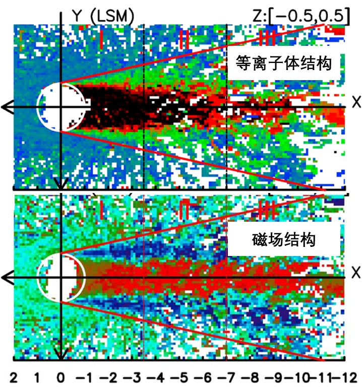 图1 对称尾迹中的等离子体(上图)和磁场强度(下图)分布(Zhang et al., 2014)