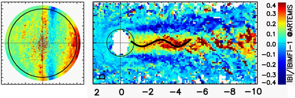 月球是等离子体的良好吸收体,从磁流体的角度看,太阳风冲击月球时,会被月球向阳面吸收,从而在月球背面形成等离子体空腔。月球又近似为绝缘体,行星际磁场可毫无阻碍地穿透月球进入到等离子体空腔中。此后,由于磁流体压强平衡需要,周遭太阳风会逐步回填到等离子体空腔中。回填过程会稀疏周边的行星际磁场,并挤压空腔中部的磁场使其增强。这些全球尺度的等离子体和磁场扰动构成月球“尾迹”。无论从等离子体还是磁场看,研究者都没有期待月球尾迹呈现关于太阳风的非对称结构(见图1)。