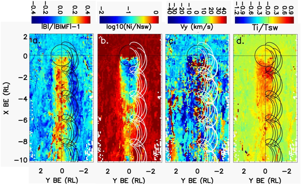 图3 尾迹中磁场强度、等离子体密度、垂直速度和离子温度的分布。白/黑曲线为向阳面太阳风反射离子的漂移轨迹