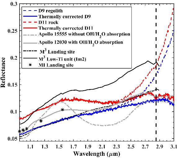 光谱技术是目前探测月球水及其分布较为直接的方式。羟基(OH)和/或水分子在光谱3微米附近具有明显的吸收特征。通过分析3微米附近的光谱特征,就可以识别月表水并获得水含量。当然,这里的依然指的是指水分子或者羟基,因为目前获得的月球光谱遥感数据波段覆盖范围无法区分月表水是羟基还是水分子的存在形式。我们知道,月表温度在当地中午可达100以上,如此高温下月壤产生的热辐射会改变2微米之后的光谱形态,从而掩盖水的特征。因此光谱的热校正是研究月表水重要的一步,而获取准确的月表温度是光谱热校正的关键(图1)。月球LRO卫星的DIVINER探测器可以获取月表的温度,但都是利用热红外波长(>7微米)进行测量的,由于月表非等温性和不同波长的穿透深度不同,且真空条件下月壤层存在较大的热梯度,从以热发射为主的光谱波段估算的温度不能直接适用于2-4微米的区域。然而,由于在2-4微米的光谱区域,光谱仪接收到的反射和发射能量都占有很大比例,因此从光谱中准确估计温度是非常具有挑战性的。