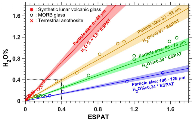 嫦娥五号光谱仪对采样区约2×2米范围的区域进行了光谱观测,除了月壤之外还包括了一块没有带回来的岩石(图2A)。基于热校正后的光谱检测2.85微米处的特征,发现岩石和月壤体现出不同程度的吸收(图1)。实验室的数据显示矿物中水的含量与其光谱吸收强度具有很好的线性关系,这个线性关系主要与粒径相关(图1)。根据目前已有月壤样品的测量,它们的平均粒径约60-80微米,据此估算嫦娥五号采样区的水含量在120 ppm(百万分之120)以下;而岩石中的水含量约为180 ppm