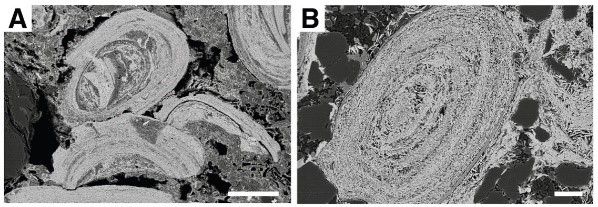 1 元古宙GIF的背散射图像。(A)~1880 Ma Gilbralter组中多种赤铁矿鲕粒形态,可见碎片状的鲕粒,说明沉积过程中的扰动再造;(B~750 Ma Galeros组中赤铁矿鲕粒和胶结的石英颗粒。比例尺为100 μm