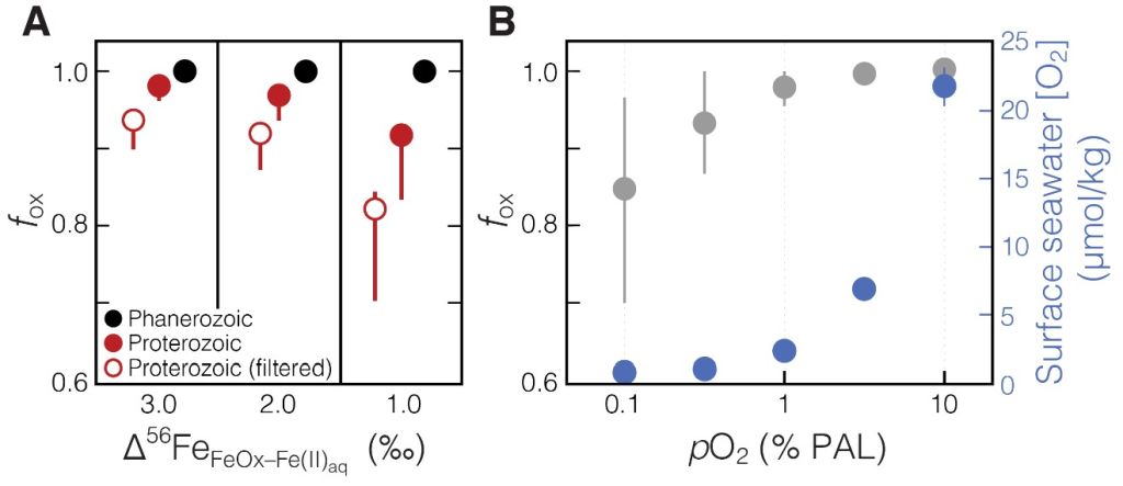 3 基于铁同位素分馏机制的元古宙和显生宙GIF或铁岩的铁氧化模型。(A)瑞利分馏模型,显示元古宙和显生宙IF不同的铁氧化程度;(B)铁氧化的动力学模型,涉及特定范围内的酸碱度和温度背景值。基于水-气交换平衡,可同时估算表层海水和大气氧含量