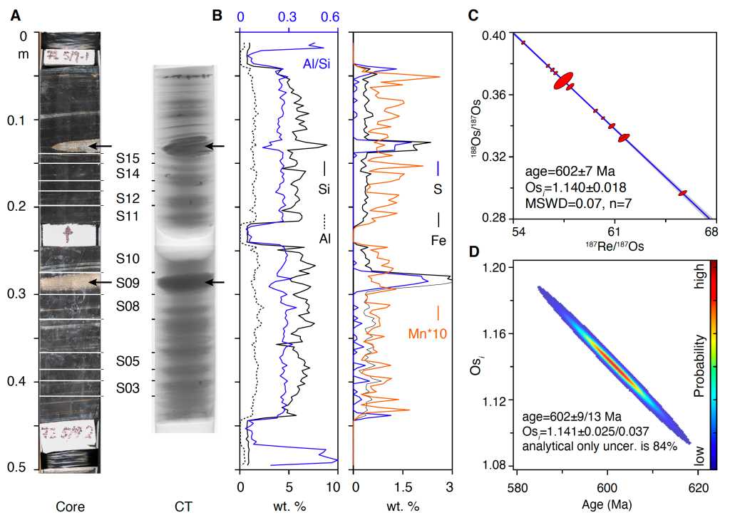 基于岩芯CT和XRF扫描,研究团队选取了一段长~35 cm的岩芯。该段岩芯地球化学组成稳定、发育良好的沉积纹层,暗示其形成后未受后期地质事件改造,适合Re-Os同位素定年研究。在高精度Re-Os同位素分析的基础上,该团队采用自主研发的蒙特卡罗和反等时线技术(Li et al., 2019; Li and Vermeesch, 2021)完成数据处理。联合可靠的地层学工作和改进的Re-Os定年技术,研究团队成功获得一条年龄为602 ± 7 Ma、Os同位素初始值为1.14 ± 0.02的等时线(图1)。CT和XRF指导下的可视化Re-Os定年技术及数据处理方法具有普适意义,将有望显著提高沉积岩Re-Os定年成功率及结果的可靠性。