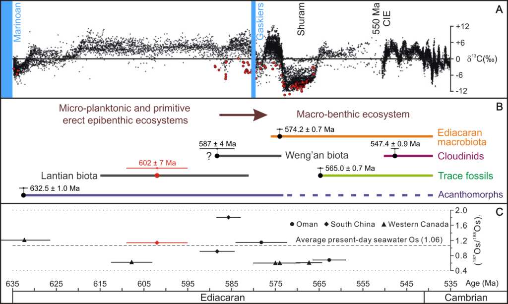 图2 埃迪卡拉纪主要生物群年龄及碳酸盐岩C同位素和黑色页岩初始Os同位素组成