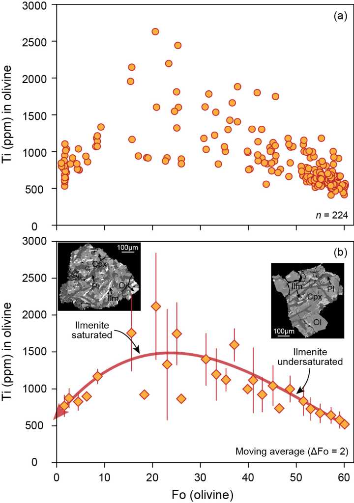 图2 嫦娥五号玄武岩中橄榄石Fo vs. Ti 图解,图(b)是图(a)中数据移动平均的结果