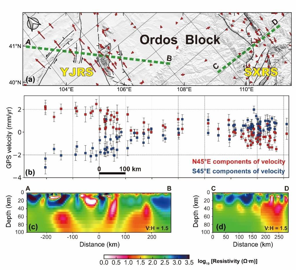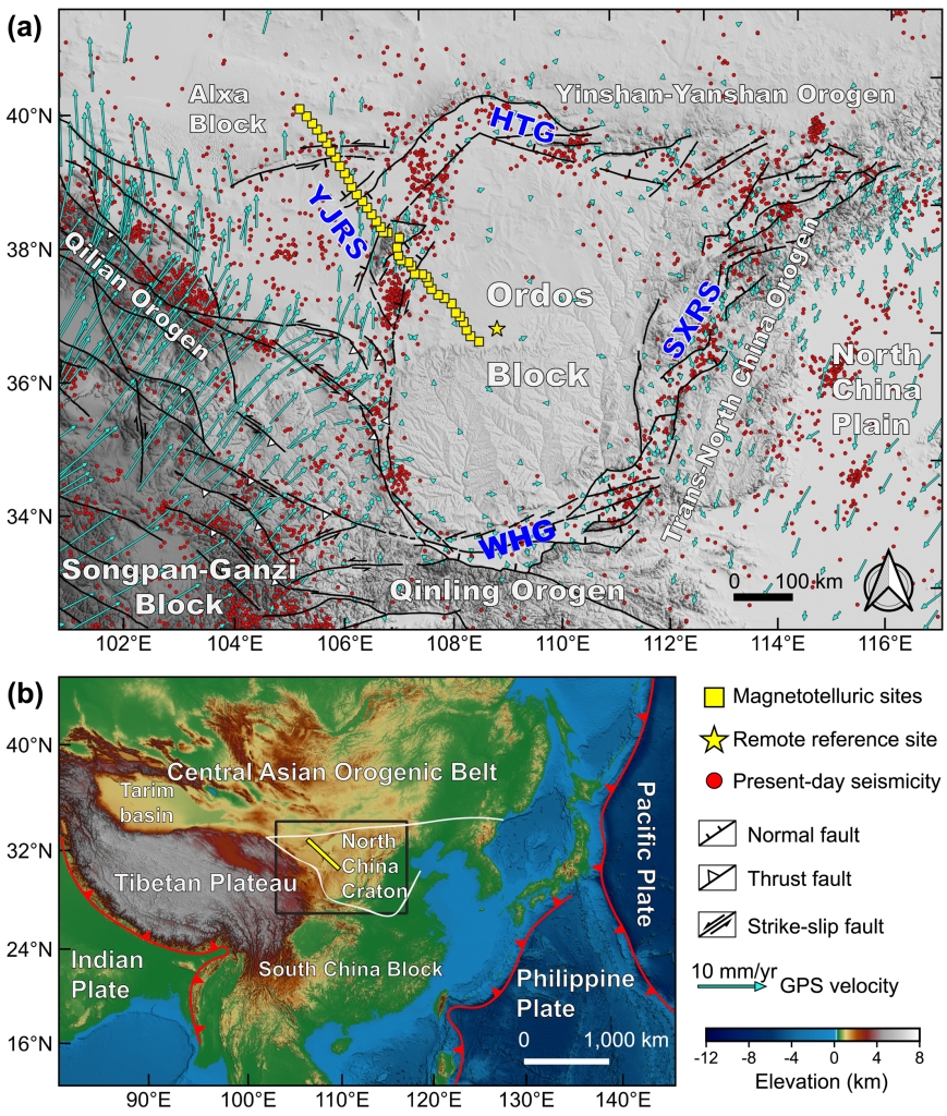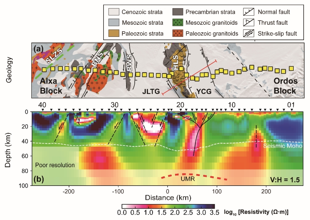 针对上述问题,800彩票岩石圈演化国家重点实验室壳幔结构探测团队对鄂尔多斯西北缘的银川-吉兰泰裂谷开展了大地电磁测深成像研究(图1)。大地电磁测深(MT)是一种利用天然平面电磁波探测壳幔电性结构的被动源地球物理方法。由于岩石电导率对温度、熔流体含量变化敏感,该方法被广泛应用于约束岩石圈热结构和熔/流体活动。