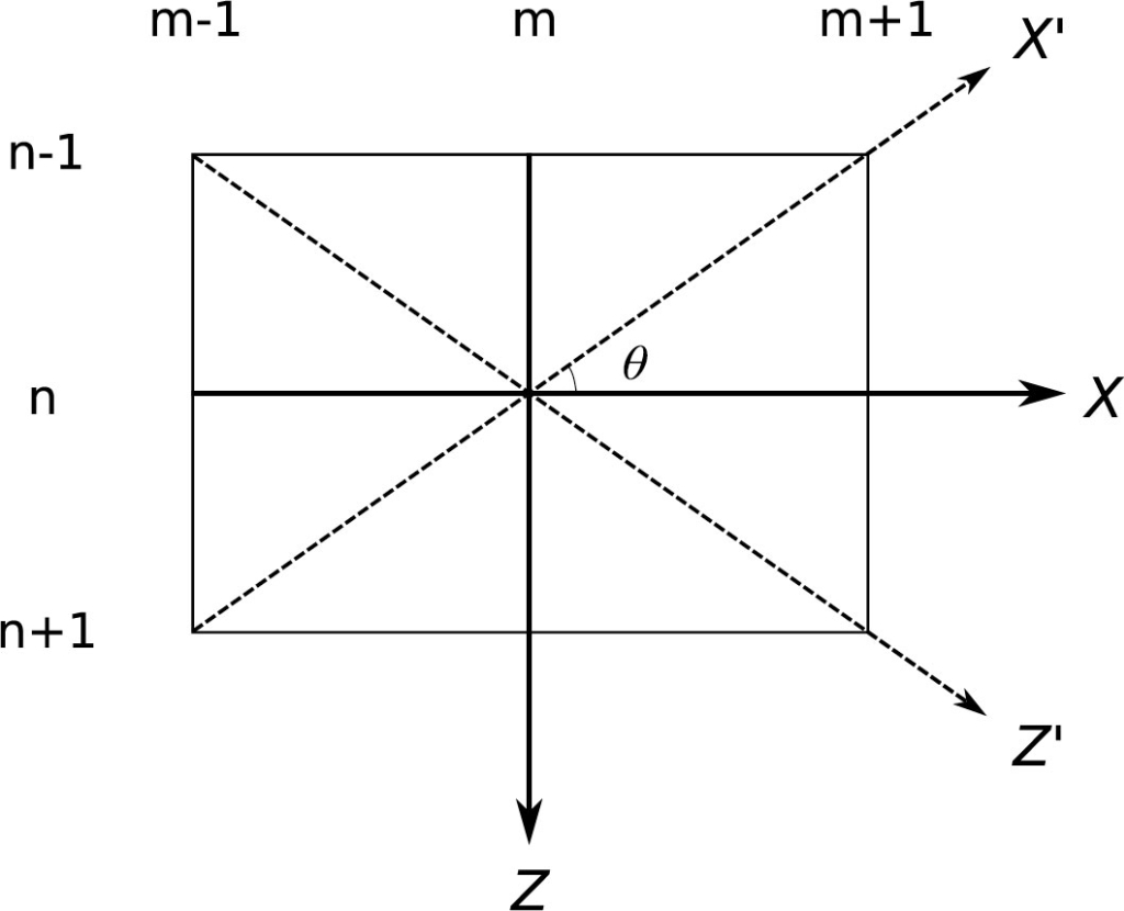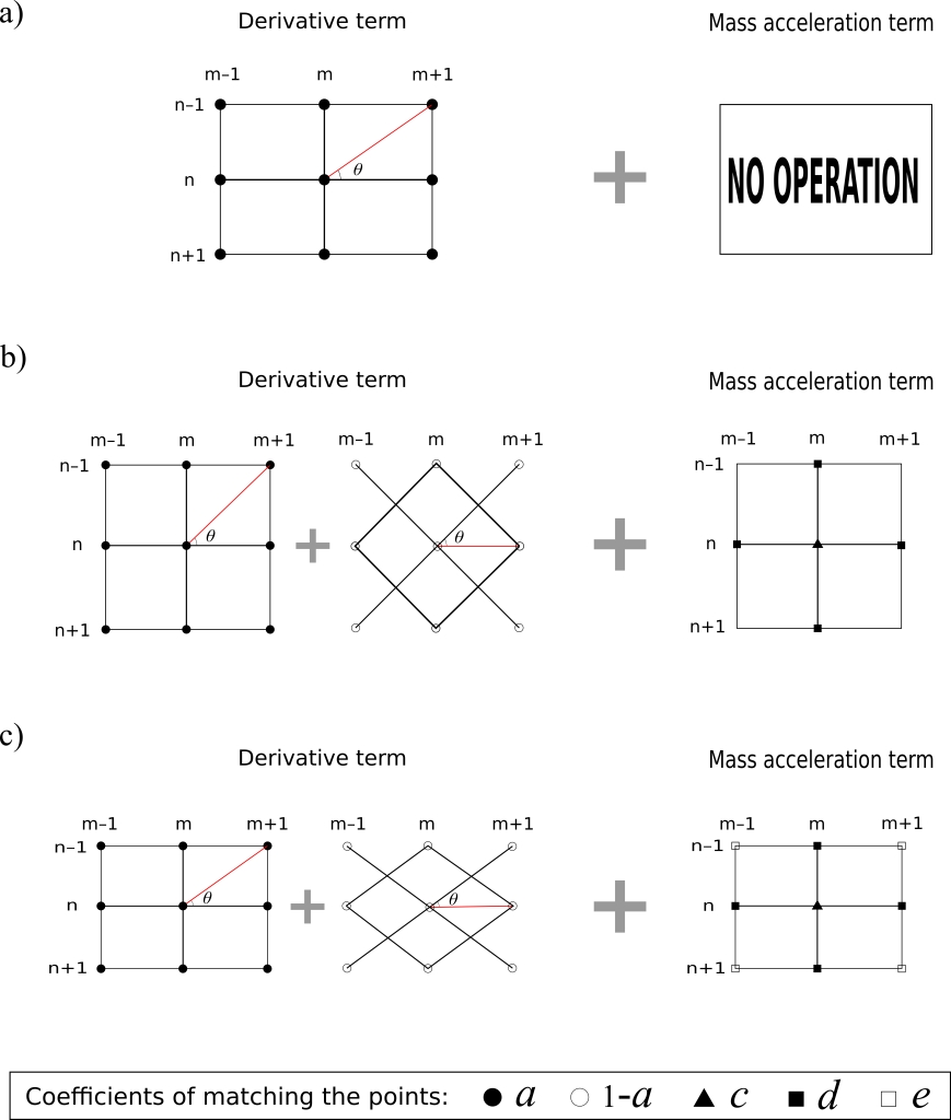 图1 (a)传统9点方法:θ角没有限制,但数值精度低,需要很高的计算成本才能满足精度要求;(b)旋转优化9点方法:数值精度高,但θ角必须为45°,在一些稀疏采样就能满足精度要求的方向上必须进行密集采样;(c)仿射优化9点方法:数值精度更高,且θ角没有限制,在节省计算资源上具有更多的灵活性