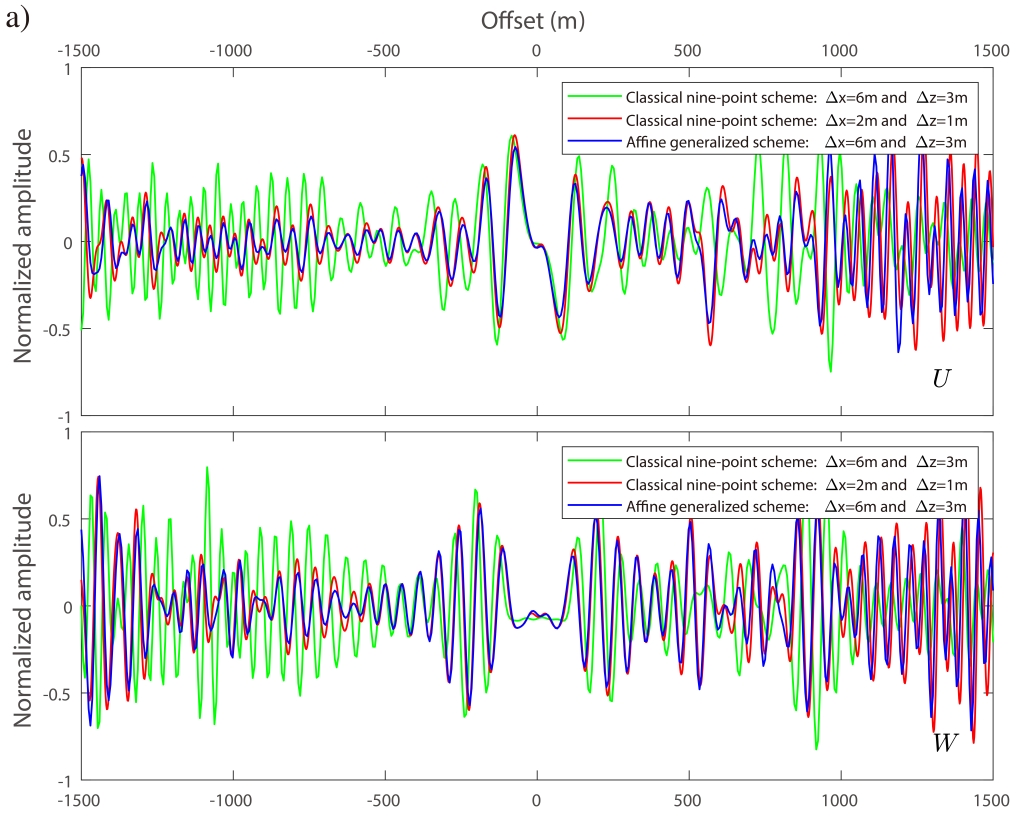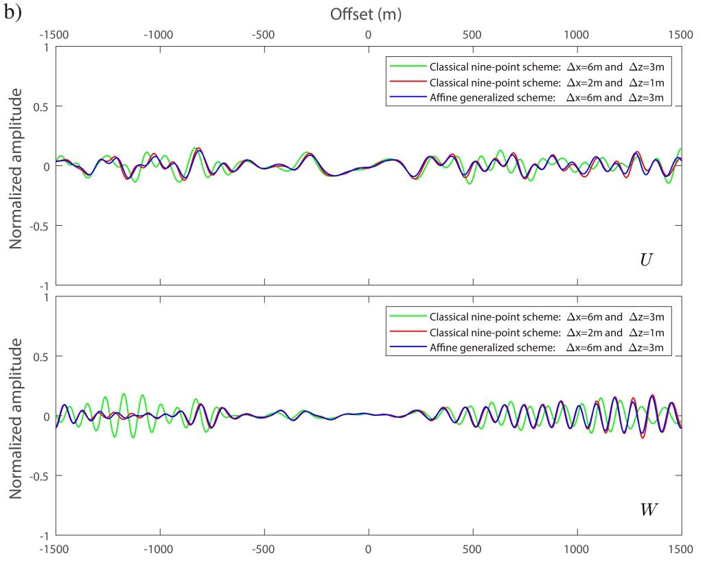 为解决上述问题,中科院地质与地球物理研究所油气资源研究院重点实验室董树立博士及其导师陈景波研究员提出了仿射坐标变换法(如图1c)。与笛卡尔坐标系不同,仿射坐标系不必约束坐标轴彼此正交。他们基于仿射坐标变换提出的优化9点方法同时克服了传统9点方法的低精度问题以及旋转优化9点方法的等采样间隔的限制。此外,他们还将这种仿射技术应用于对自由表面边界的处理。由于介质内部和自由表面在表达式上的高度一致性,使得二者可共享一套优化系数,同时提高了体波和面波的模拟精度。Overthrust模型数值算例表明,仿射优化方法能以更粗的空间采样网格(意味着更低的计算成本)提供高精度的计算结果(如图2所示)。这种仿射优化方法尤其适用于一些纵、横向速度不相等勘探区域和理论速度模型。