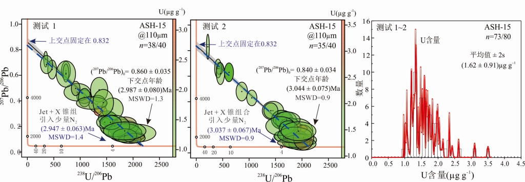 图2 ASH-15的下交点年龄和U含量结果图,其中下交点年龄结果以Tera-Wasserburg图表示;U含量变化以相对概率的形式表示。蓝色虚线为固定上交点207Pb/206Pb为0.832的等时线;黑色实线为未固定上交点的等时线。在不同时间内,共进行了2次独立分析