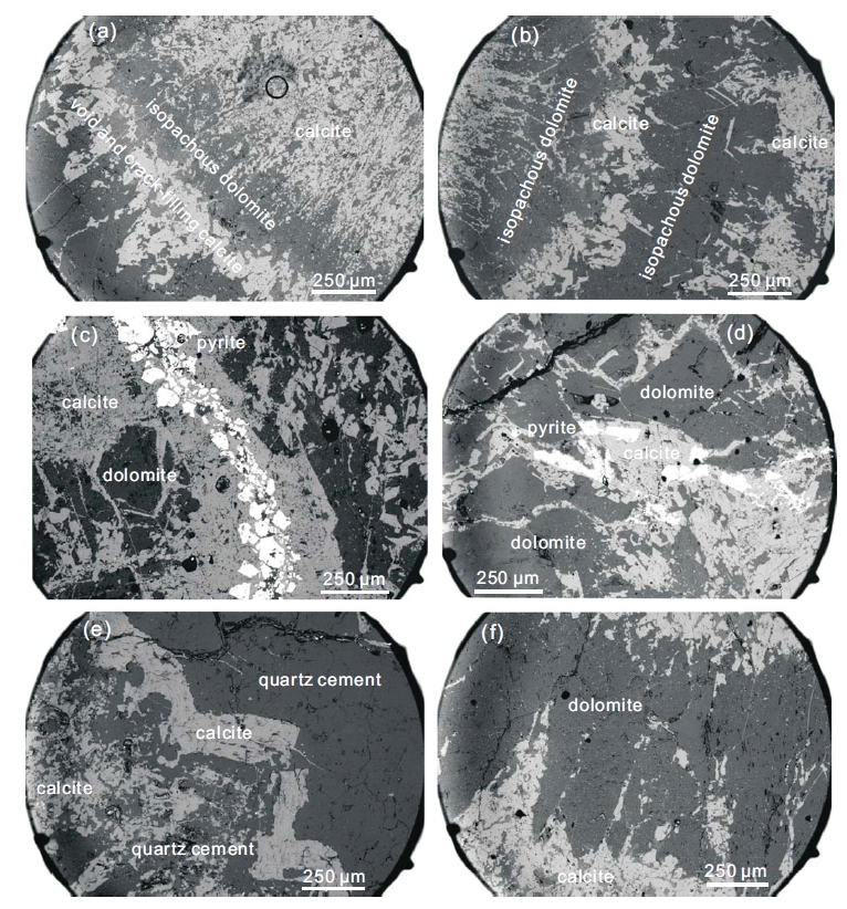 图3 三峡地区九龙湾剖面陡山沱组底部葡萄状白云岩内矿物共生组合(BSE图像)。多种形态的方解石胶结物和黄铁矿充填在等厚状白云石内部的孔洞和裂隙内,后期被石英胶结物所包裹